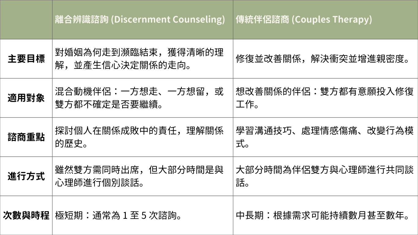 在這種時刻,直接進入以「修復關係」為目標的傳統伴侶諮商,往往會讓想離開的人感到壓力沉重,也讓想挽回的人感到挫折。這正是「離合辨識諮詢(Discernment Counseling)」發揮作用的時刻。
